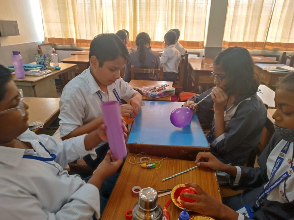 As part of Science Week celebrations, a group activity titled ‘Science in a Paper Bag’ was conducted for classes VI to VIII from 22.08.2022 to 26.08.2022. Each class was divided into eight groups and each group given a sealed paper bag containing a variety of objects from everyday life. All students participated enthusiastically and created on-the-spot models/games using the given items to exhibit scientific principles and effects, like magnetic properties, Newton’s lawsand simple machines.