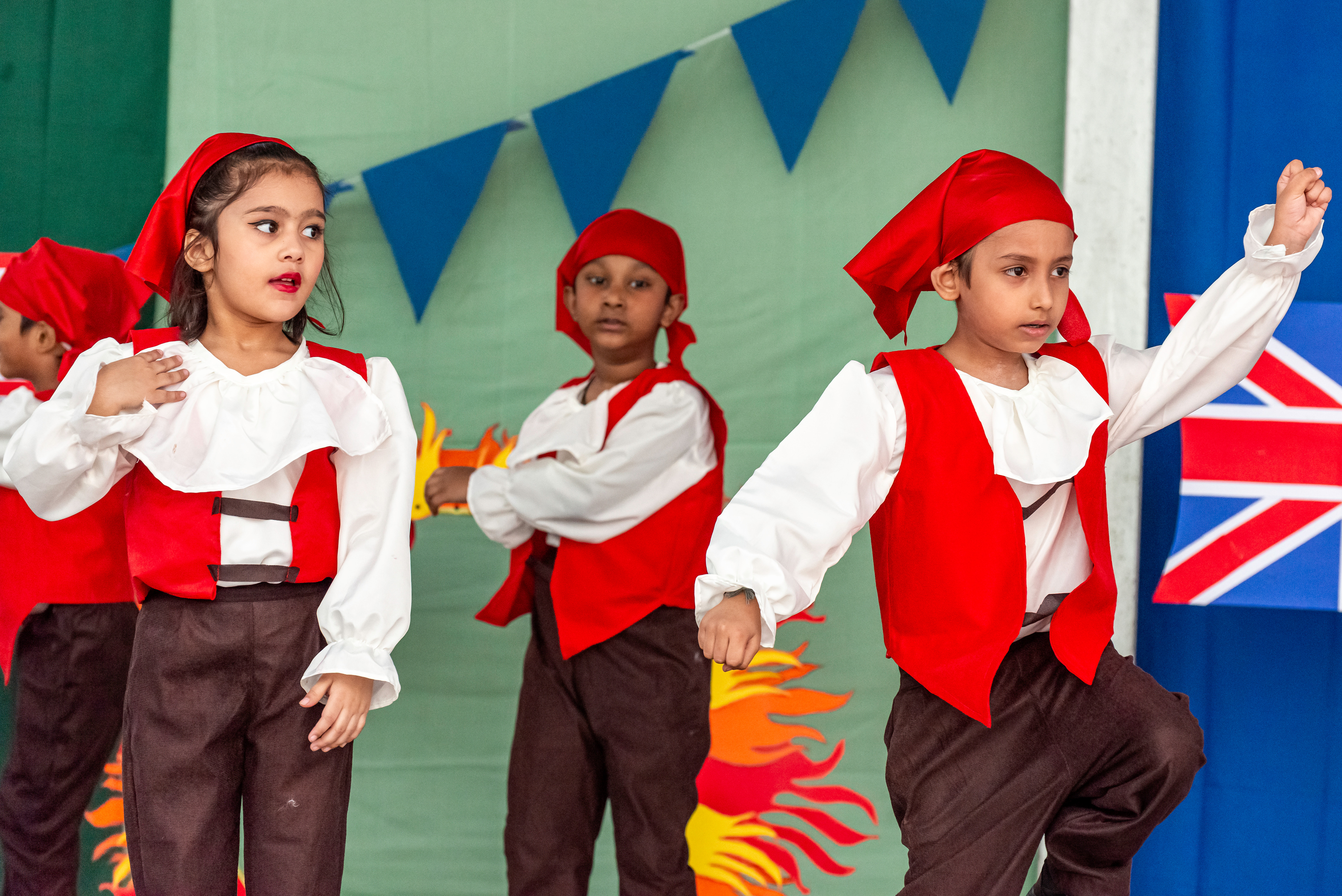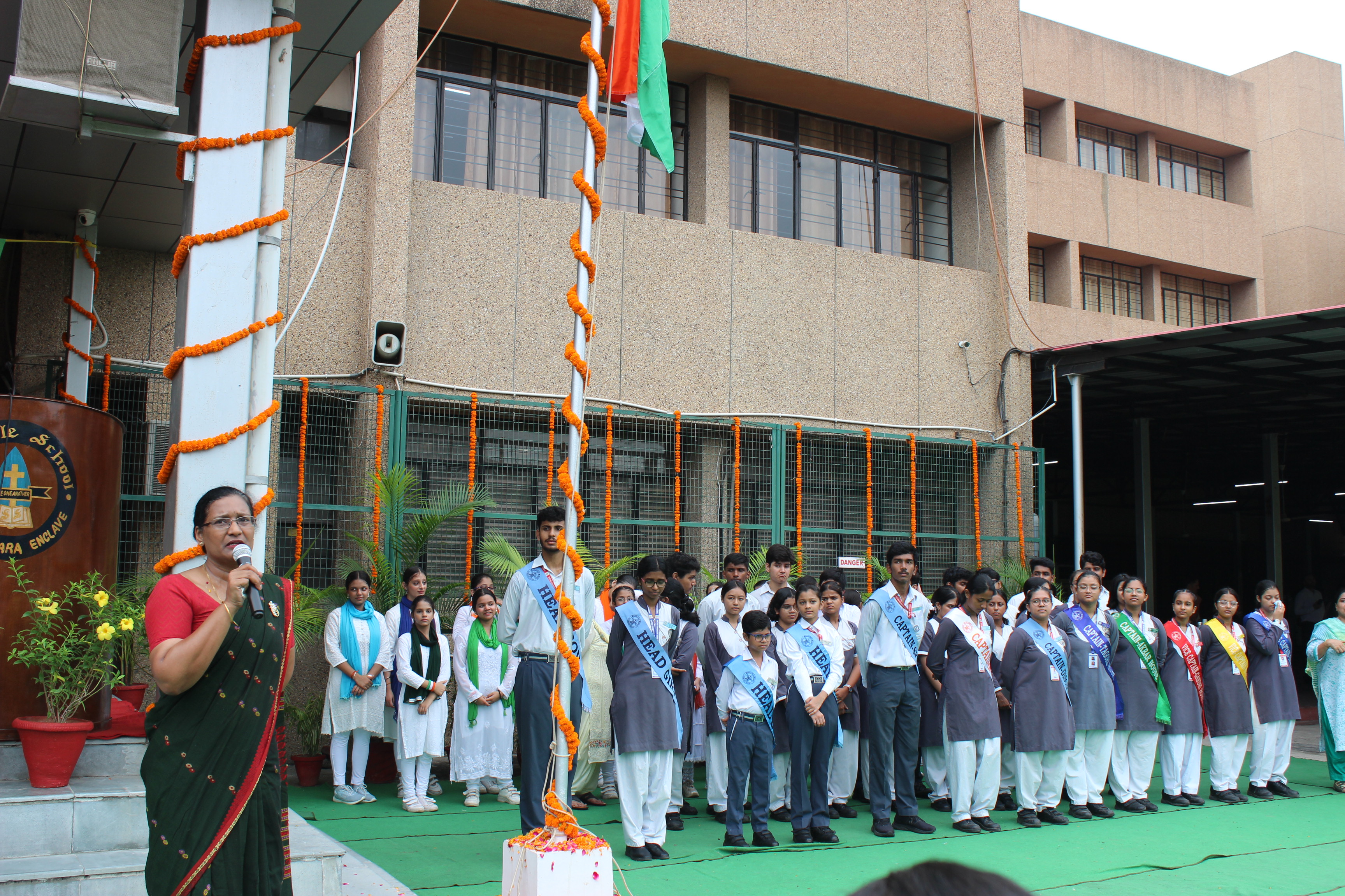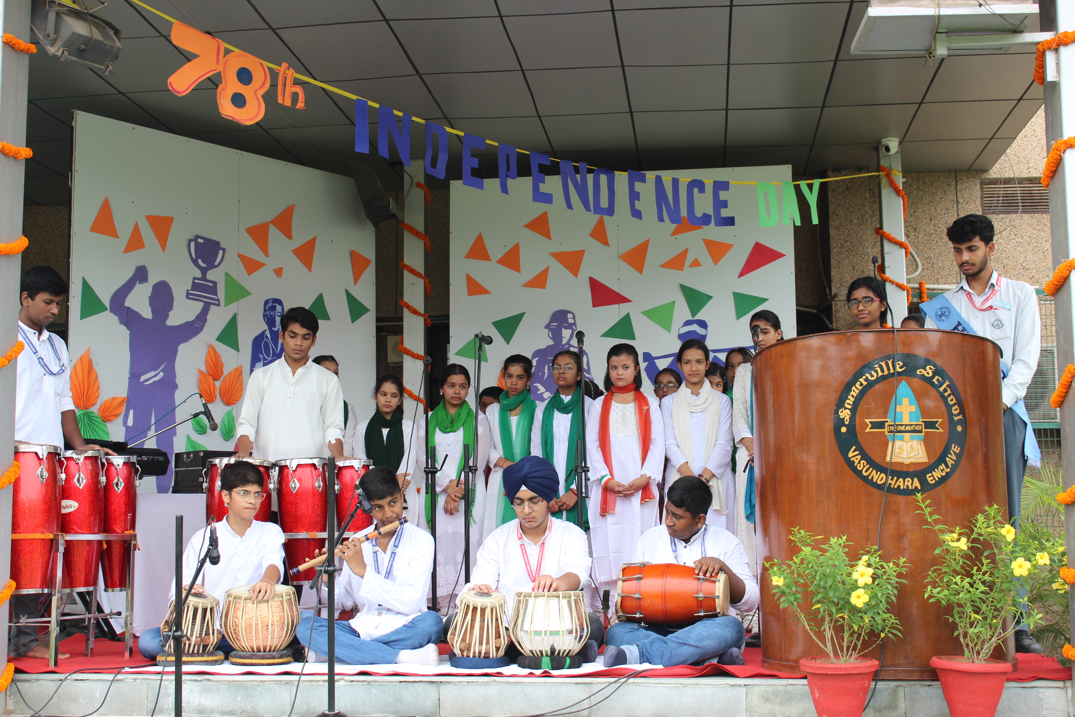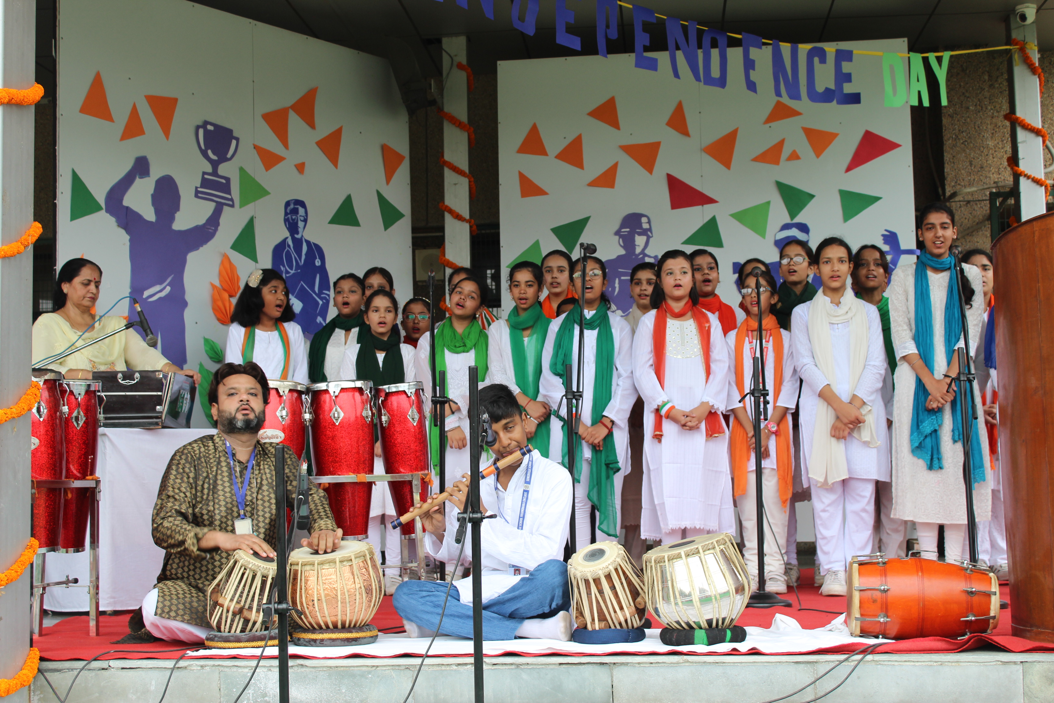 The Head Girl of the senior school, Devna Gopakumar began the programme with prayerand the Head Boy, Ritul Kumar delivered the welcome address.Four students presented a mesmerizing instrumental music composition,Albelain RaagAhirBhairav. The Head Girl of the primary school,KayraKunal Shah, spoke eloquently on the significance of Independence Day, emphasizing the role of young citizens in building the nation's future.The Indian music choir enthralled the audience with their melodious rendition of a patriotic song,SatrangiRango Sa. The Principal urged the gathering to practice the values represented by the spokes on the Ashoka Chakra in the Indian Flagand cherish the diversity of people and cultural practices that is unique to our country.