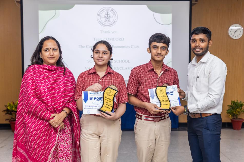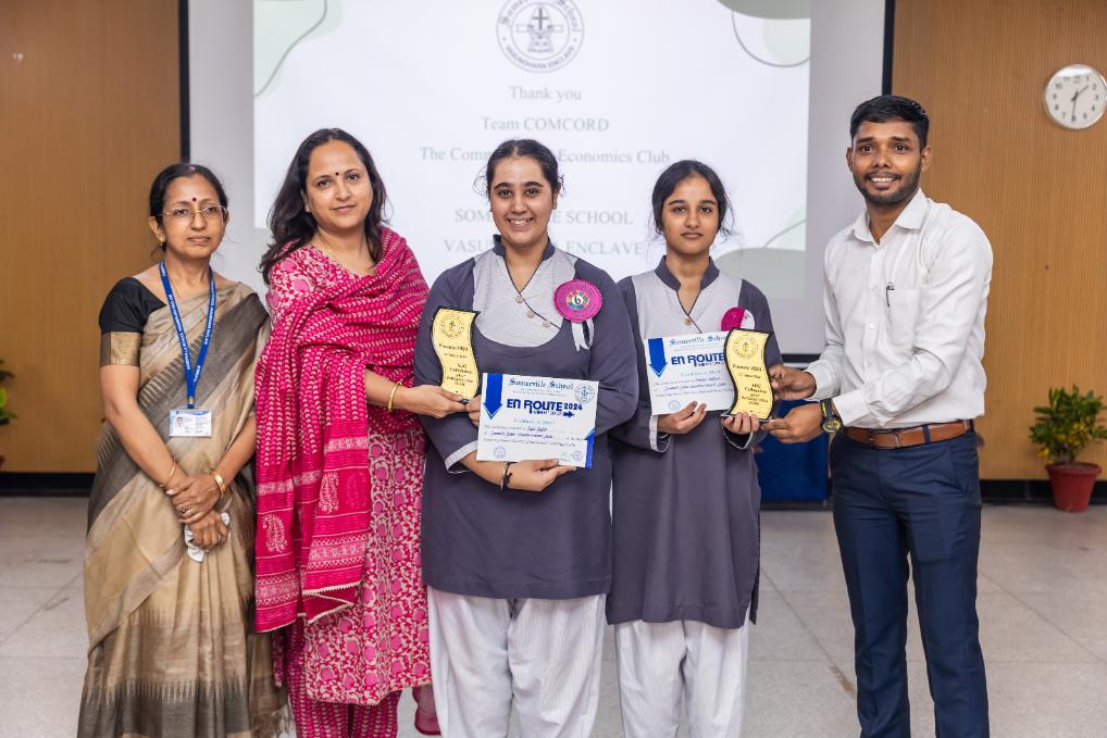 The event concluded with the prize distribution ceremony. Ms. Rita Nakra, Head of the Commerce Department, along with the judges, presented trophies and certificates to the winners. The Enroute 2024 Trophy was awarded to Somerville School, Noida.