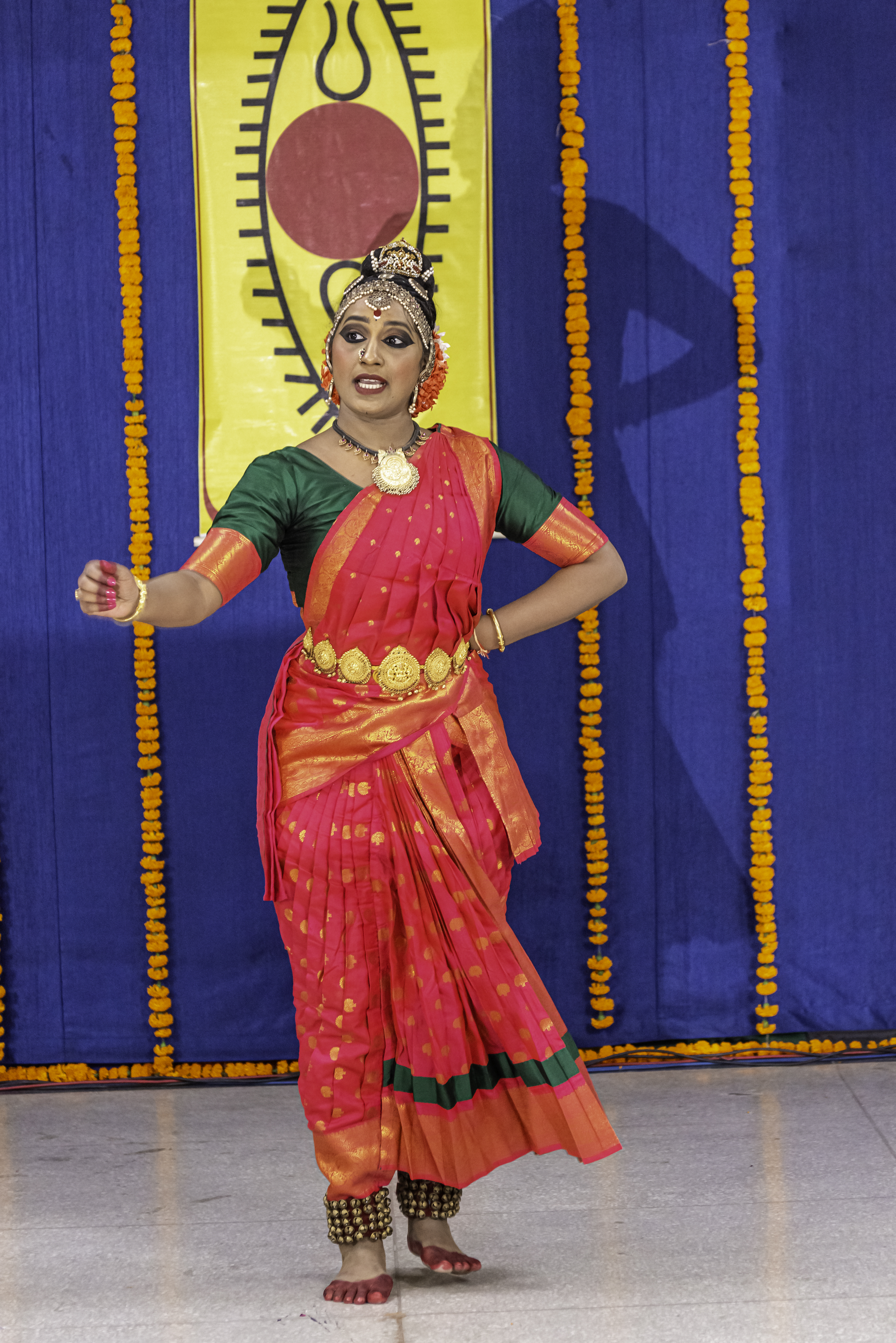 The next piece, HamsadhwaniJatiswaram, showcased intricate footwork synchronized with rhythmic patterns, all based on Raga Hamsadhwani. Lakshmi Ji took this opportunity to explain various postures, poses, and movements of Kuchipudi. The recital concluded with Shiva Tarangam, a unique feature of the Kuchipudi repertoire, where Lakshmi Ji balanced herself on the rim of a brass plate and performed rhythmic sequences dedicated to Lord Shiva, the Nataraja.