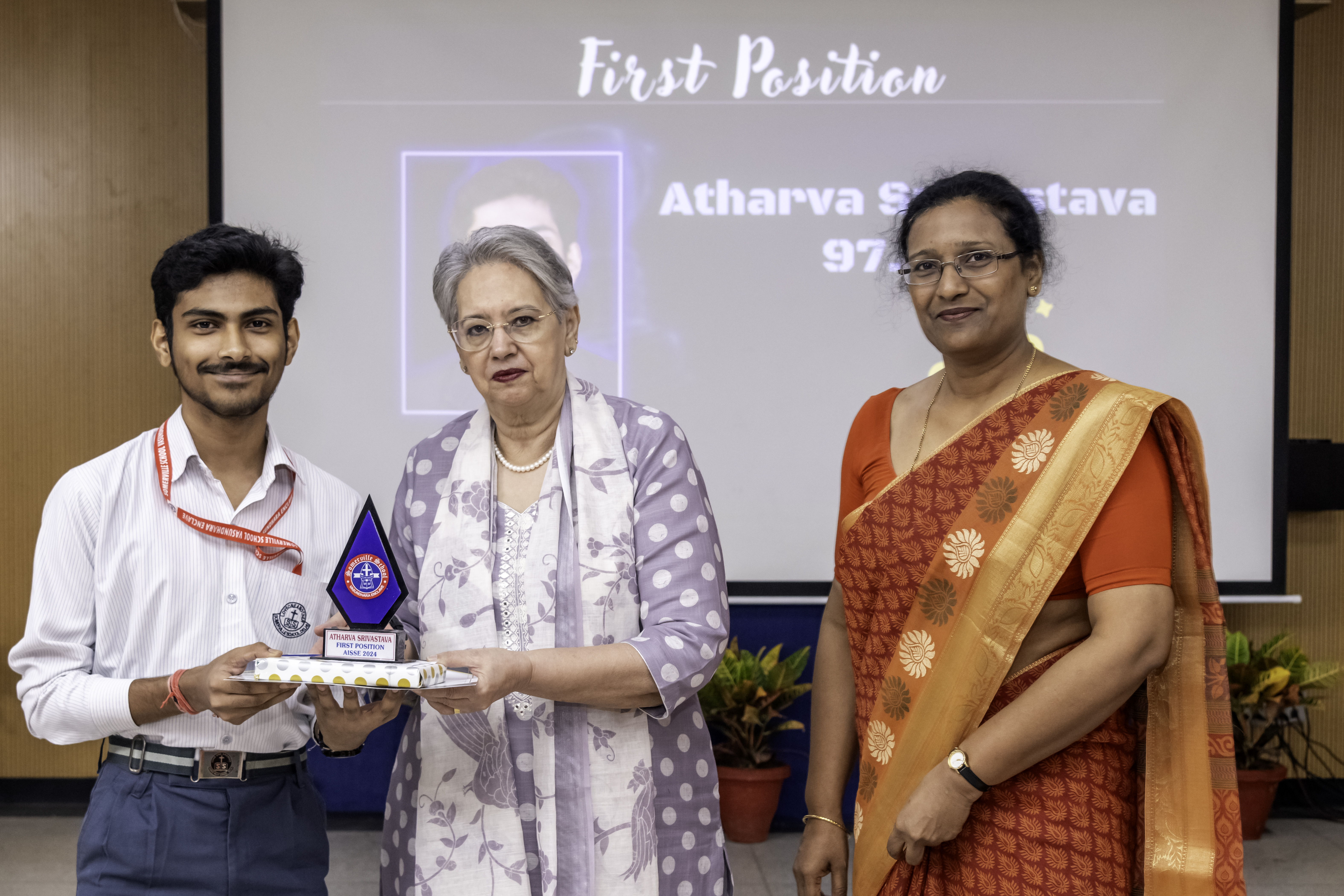 The AISSCE Awards were presented to Pranavi Jayanth (96%), Shriyanshi Aggarwal (95.8 %) and Antriksh Singhal, Lakshaya Kandpal and Raima Kapoor (95.6%) The AISSE Award winners were Atharva Srivastava (97.6), Khyati Kaushal (97.2%) and Kevin Alby Abraham (96.4%).