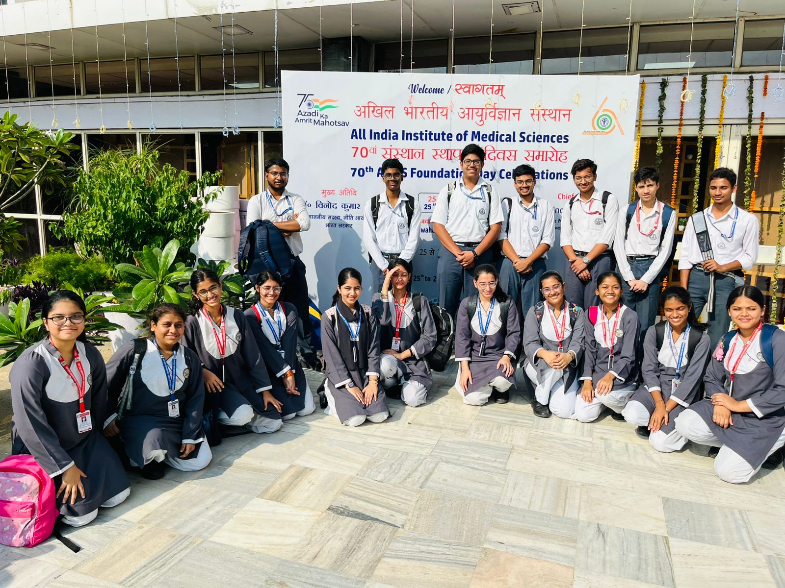 A group of 18 Biology students from our school, accompanied by two teachers Ms. Geetanjali and Ms. Pragya Pant, visited the AIIMS Health Exhibition, organized at the Jawaharlal Nehru Auditorium, AIIMS Campus, on 27th September 2025. The exhibition aimed at spreading awareness about various aspects of health, hygiene, and the functioning of the human body. The students studied the informative displays, highlighting important topics such as healthy lifestyle practices, prevention of common diseases, nutrition, and the importance of mental well-being.