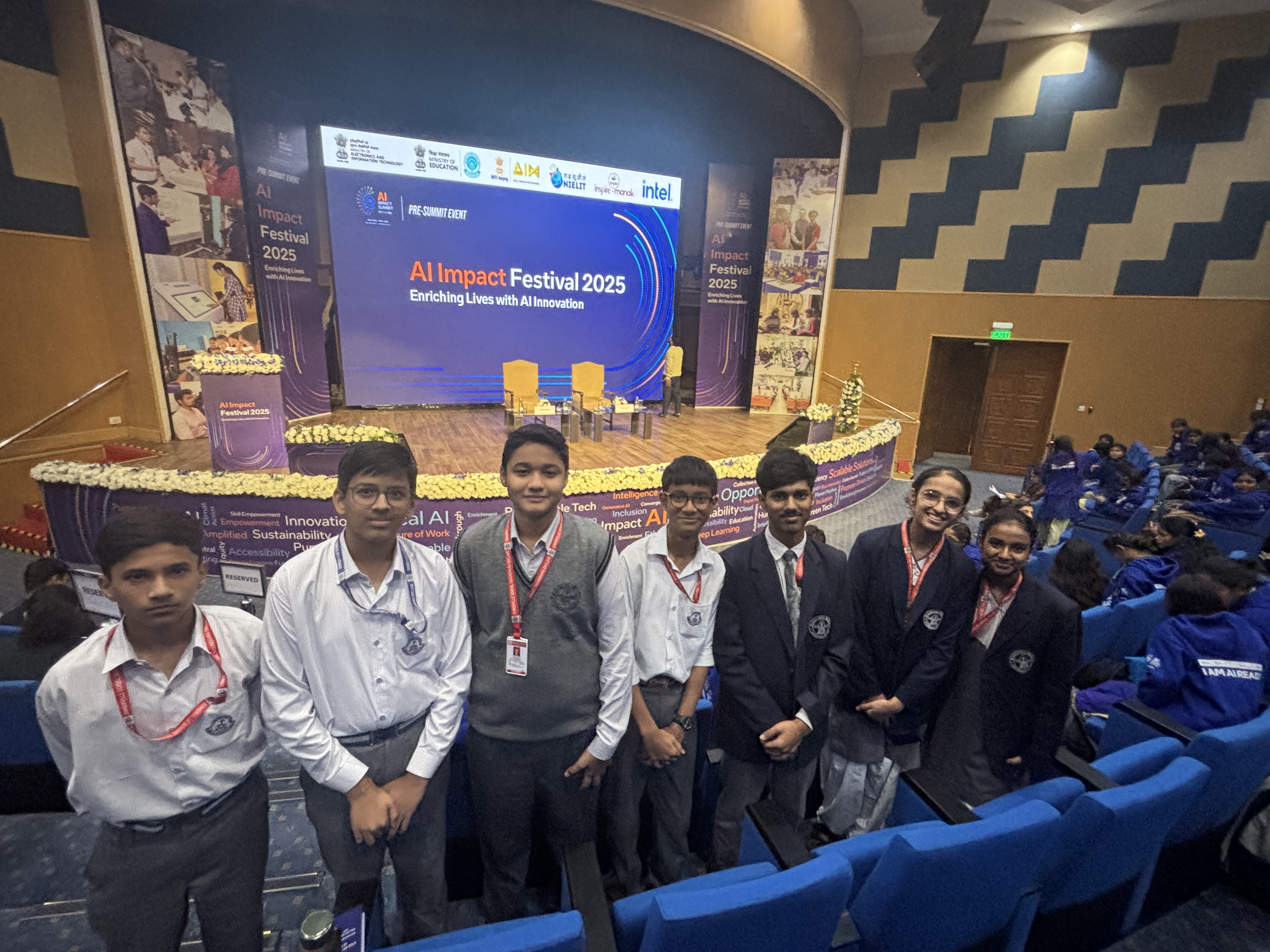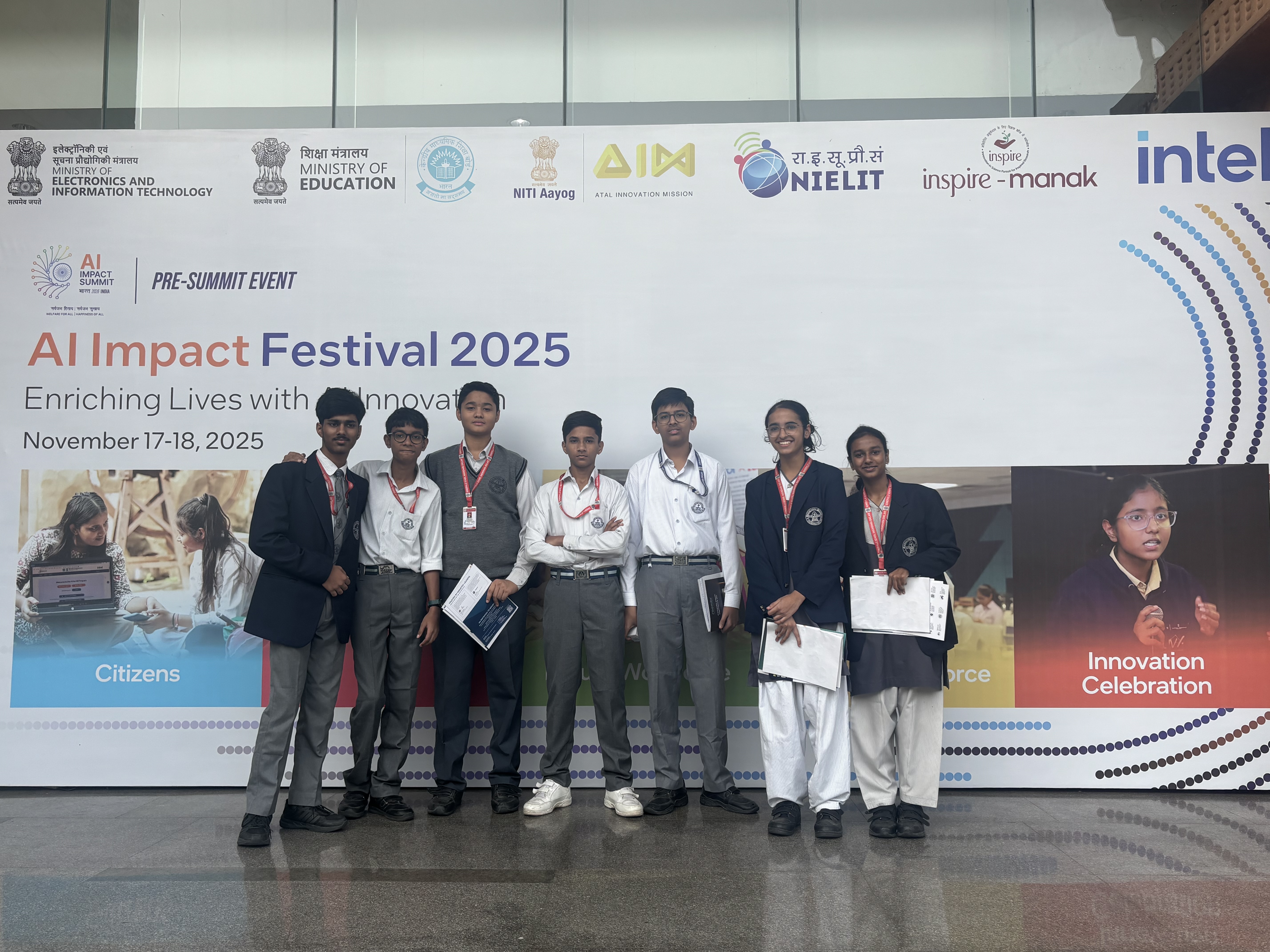 Seven students from Class IX and their AI teacher, attended the AI Impact Festival 2025, held on 18 November 2025 at Dr. Ambedkar International Centre, New Delhi. This was an official Pre-Summit event of the AI Impact Summit, to be held in February 2026, organised by India AI Mission, Ministry of Electronics and Information Technology.