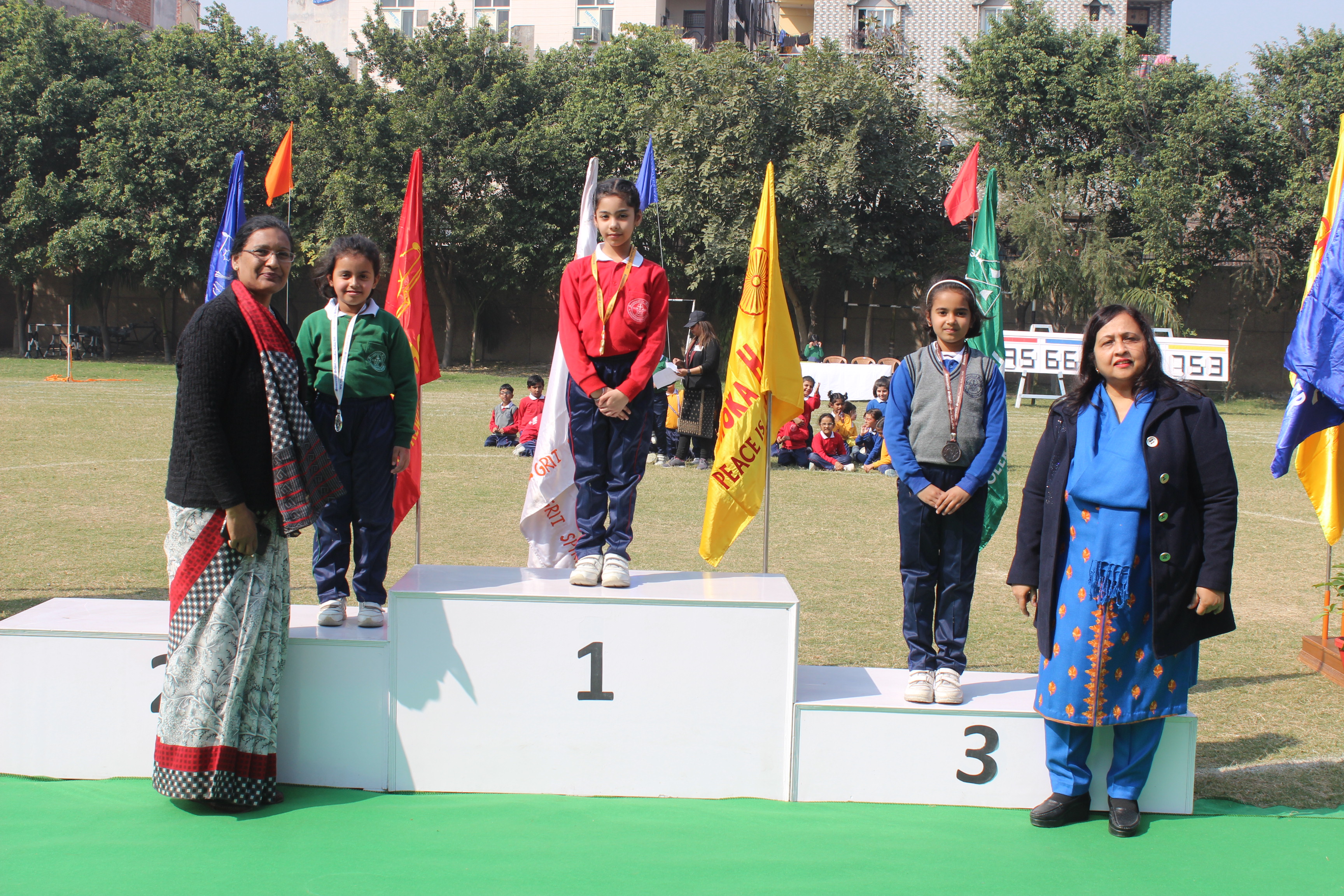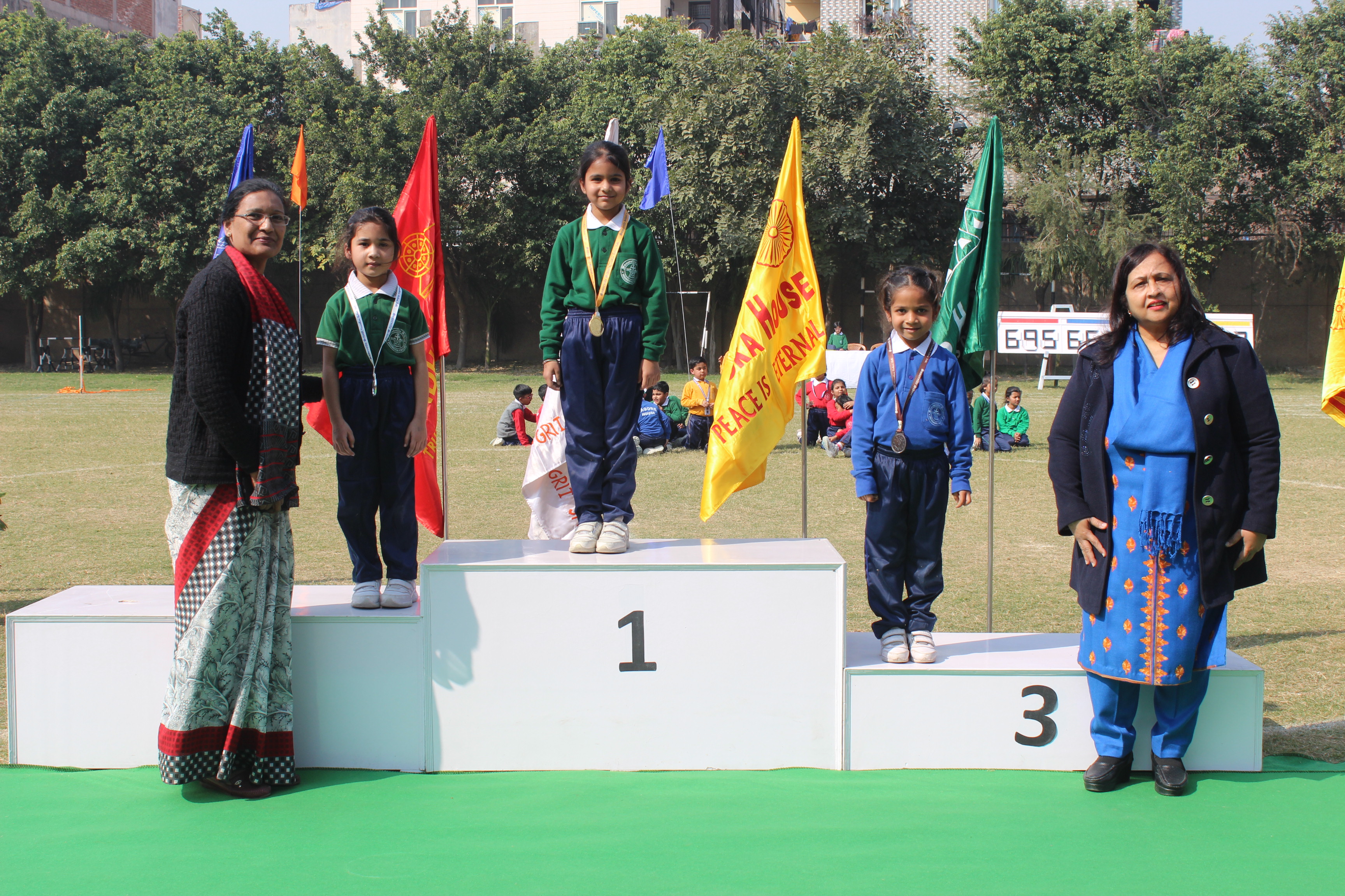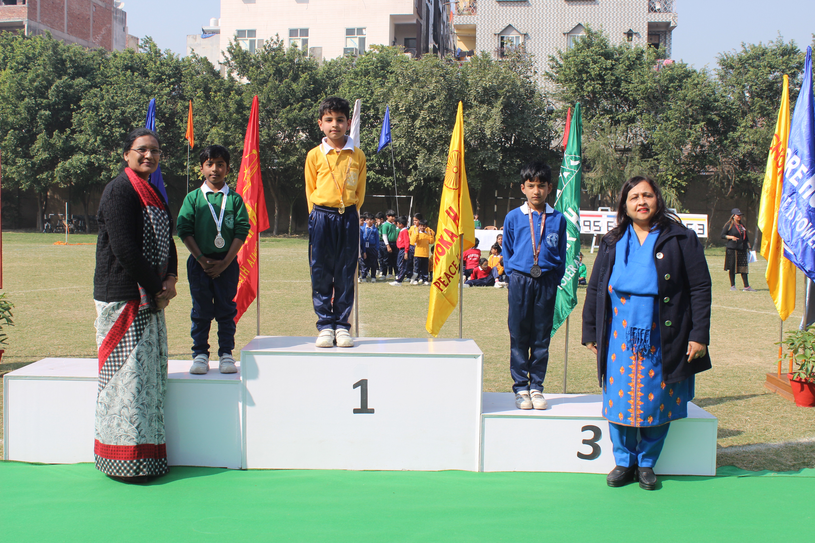 Boys and girls from Classes I, II, and III participated in track events, including the 50 m Flat Race, 75 m Flat Race and 4 x 50 m Relay Race. Before the final athletic events, various team games like Football and Basketball were organized, and the students participated with great enthusiasm. Students also participated in individual field events such as the Standing Broad Jump and Ball Throw. Medals and certificates were awarded to the winners of the track and field events.