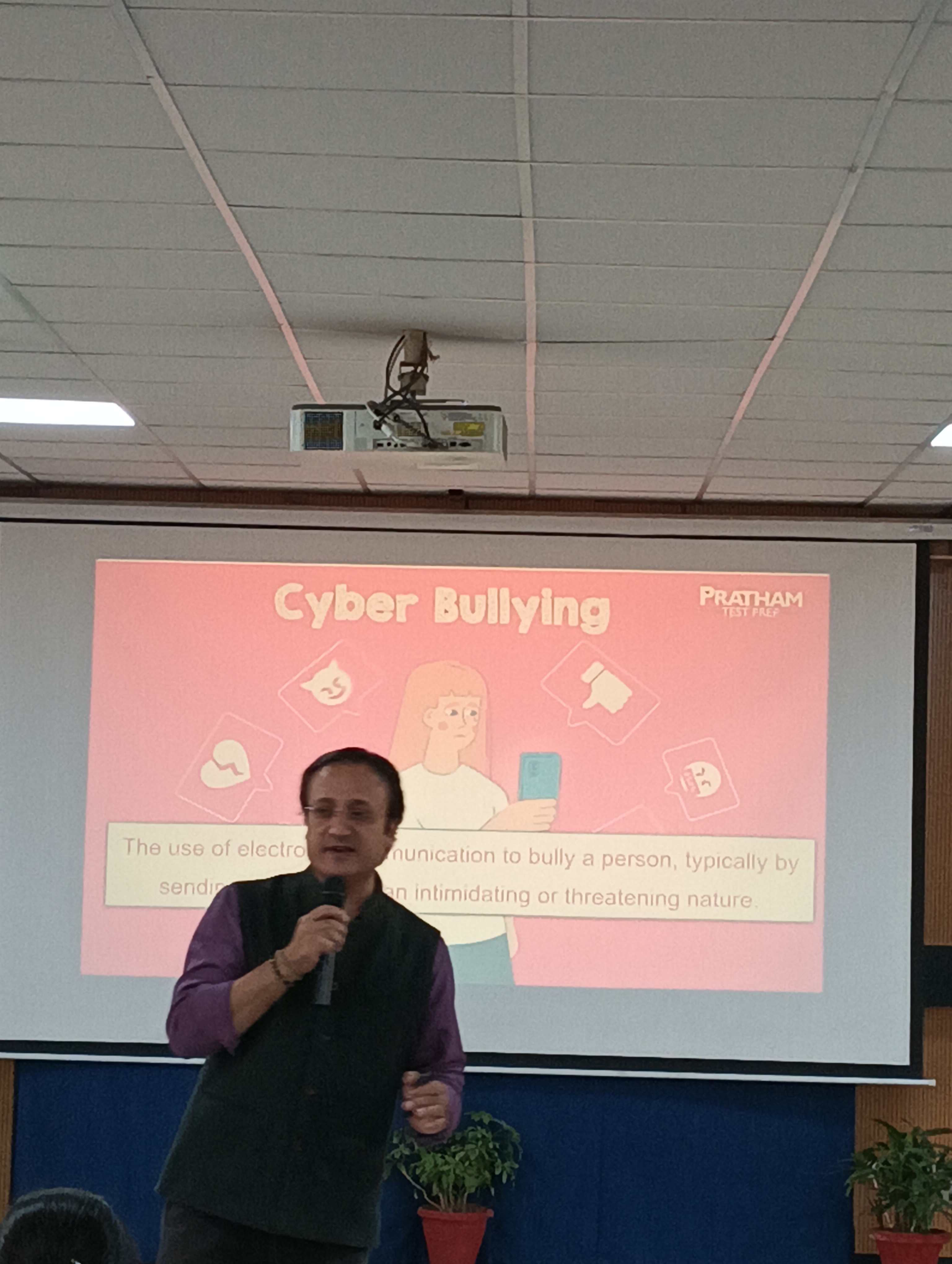 Mr. Khanna explained how teenagers are vulnerable to cyberbullying. He clarified that cyber bullying is when someone uses technology to harass, threaten, embarrass, or target another person. He also talked about signs of cyberbullying. He apprised the students about the legal age of getting registered on different social media cites and the repercussions of having an account before attaining the legal age. He also conveyed that students should be cautious of the language used and refrain from using inappropriate language on social media. He educated the students regarding proper and appropriate use of Internet and different social media platforms and sites.